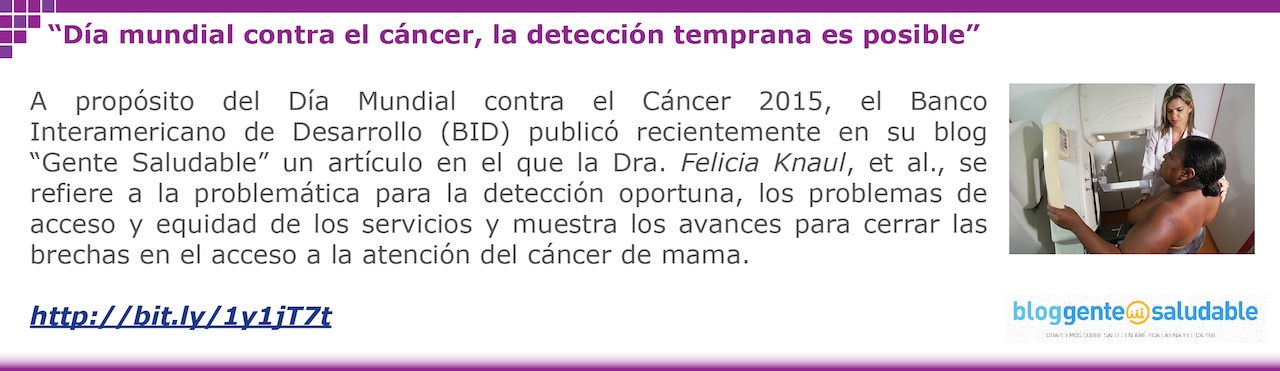 Franco-Marina F, López-Carrillo L, Keating N, Arreola-Ornelas H, Knaul FM. Breast cancer age at diagnosis patterns in four Latin American populations: A comparison with North American countries. Cancer Epidemiology: The International Journal for Cancer Epidemiology, Detection and Prevention. Published Online: October 19, 2015. http://www.cancerepidemiology.net/article/S1877-7821(15)00214-3/abstract